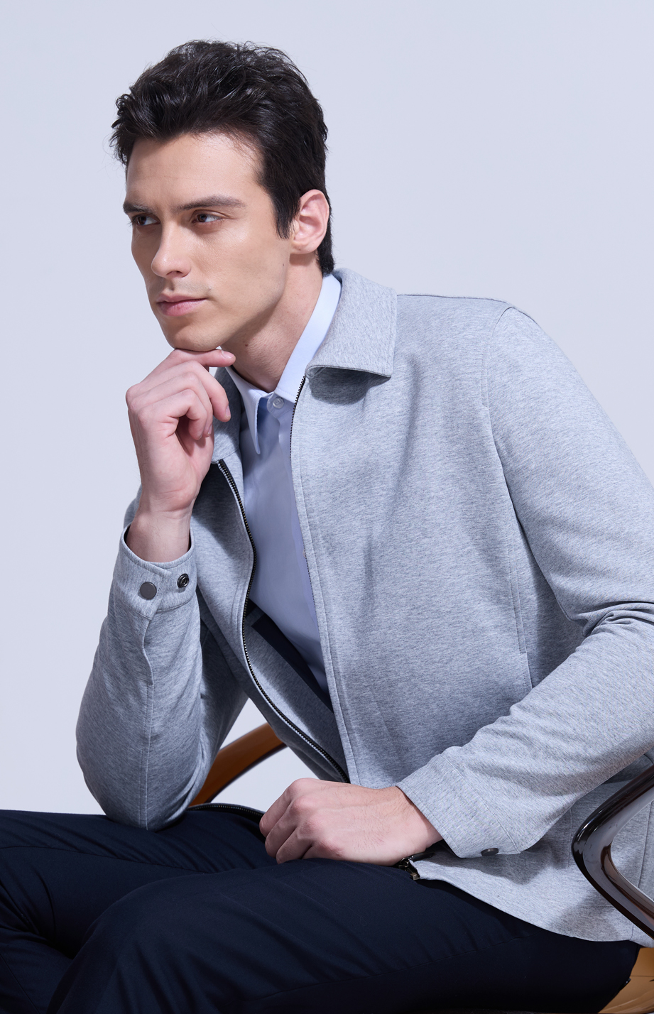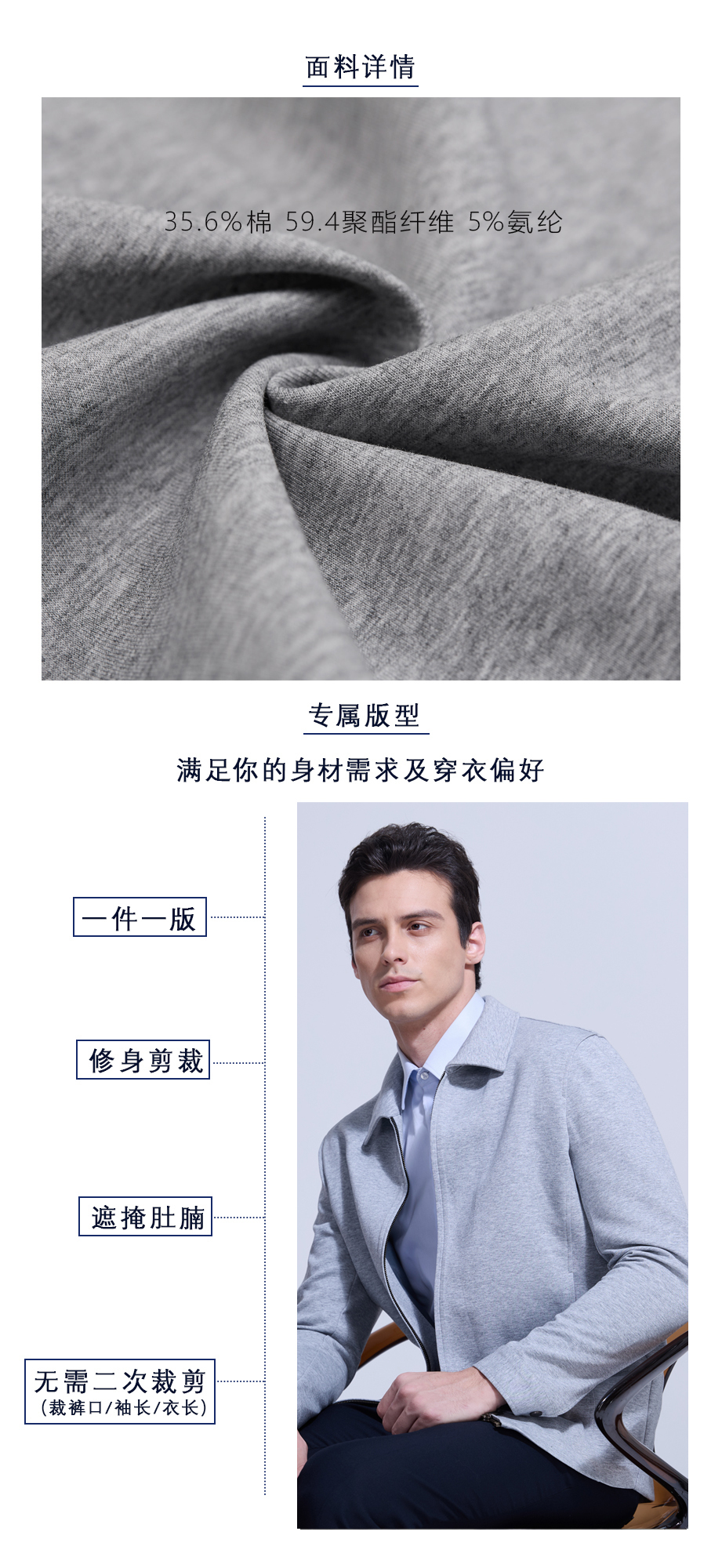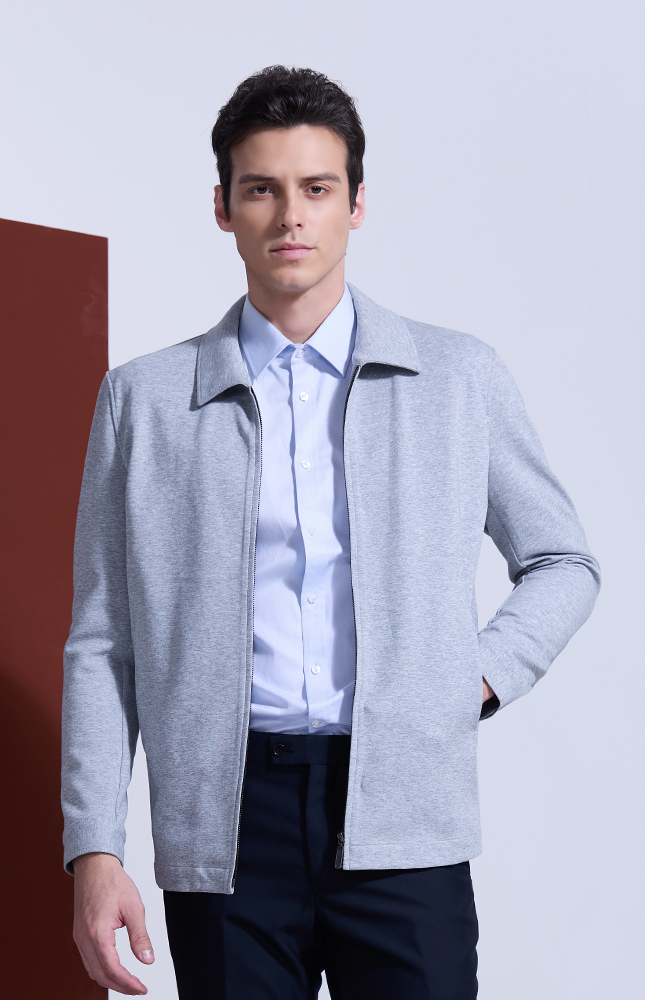 定制针织茄克-浅灰色35.6%棉聚酯混纺翻领针织茄克