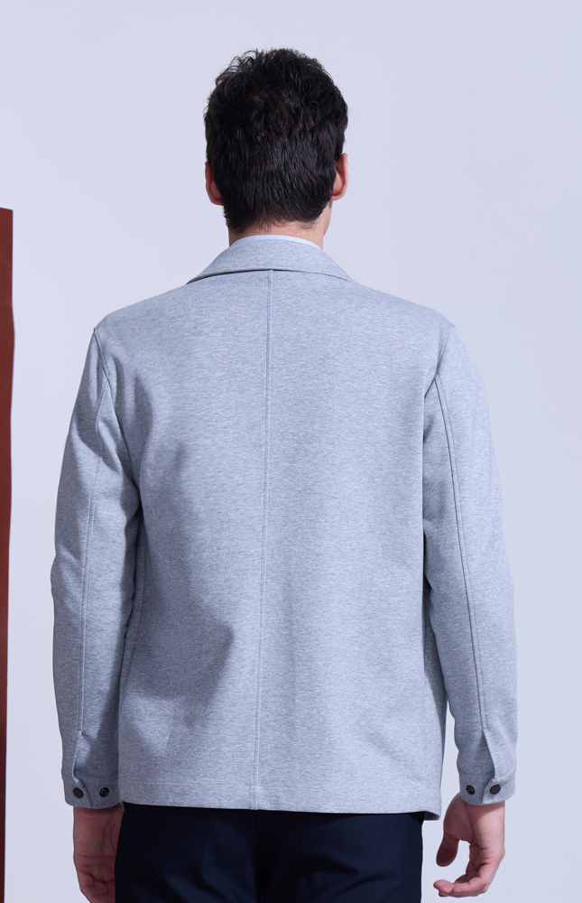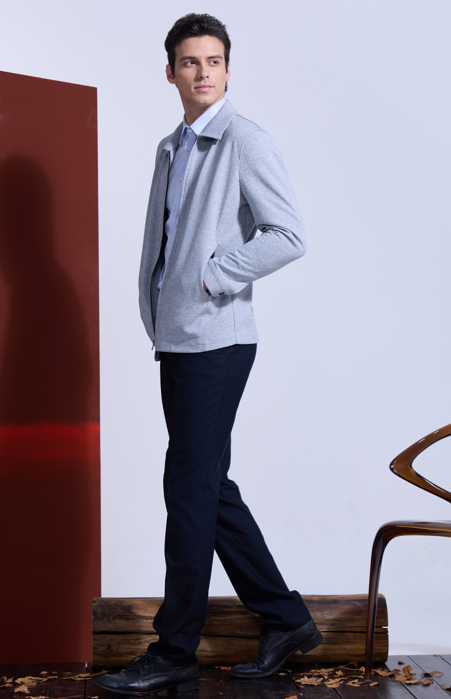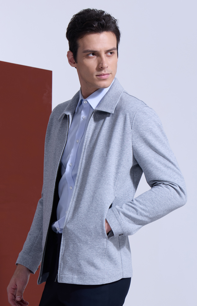 浅灰色35.6%棉聚酯纤维混纺针织翻领休闲茄克